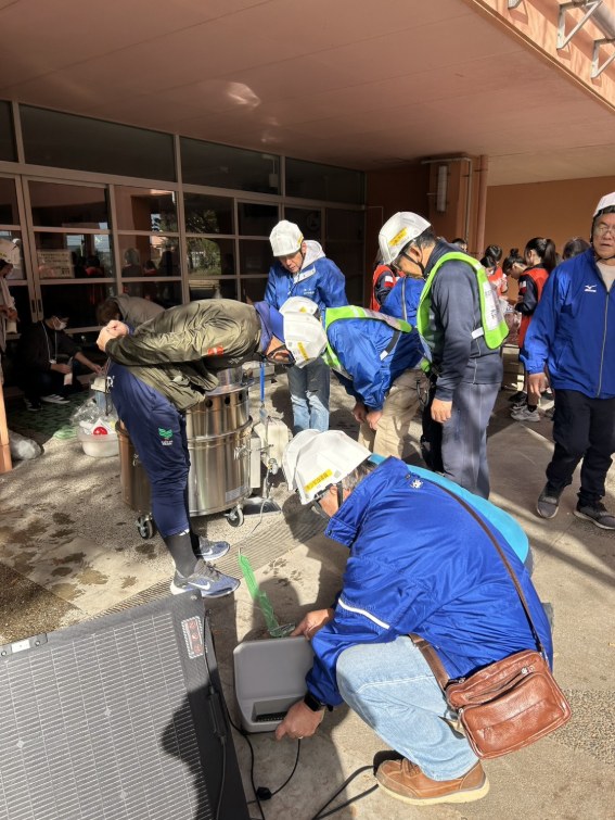 今回はソーラー電池パネルで発電し、ポータブルバッテリーに蓄電した電気を使って、炊き出し機器への電気供給を行いました。晴れていればソーラーパネルはとても有効です。