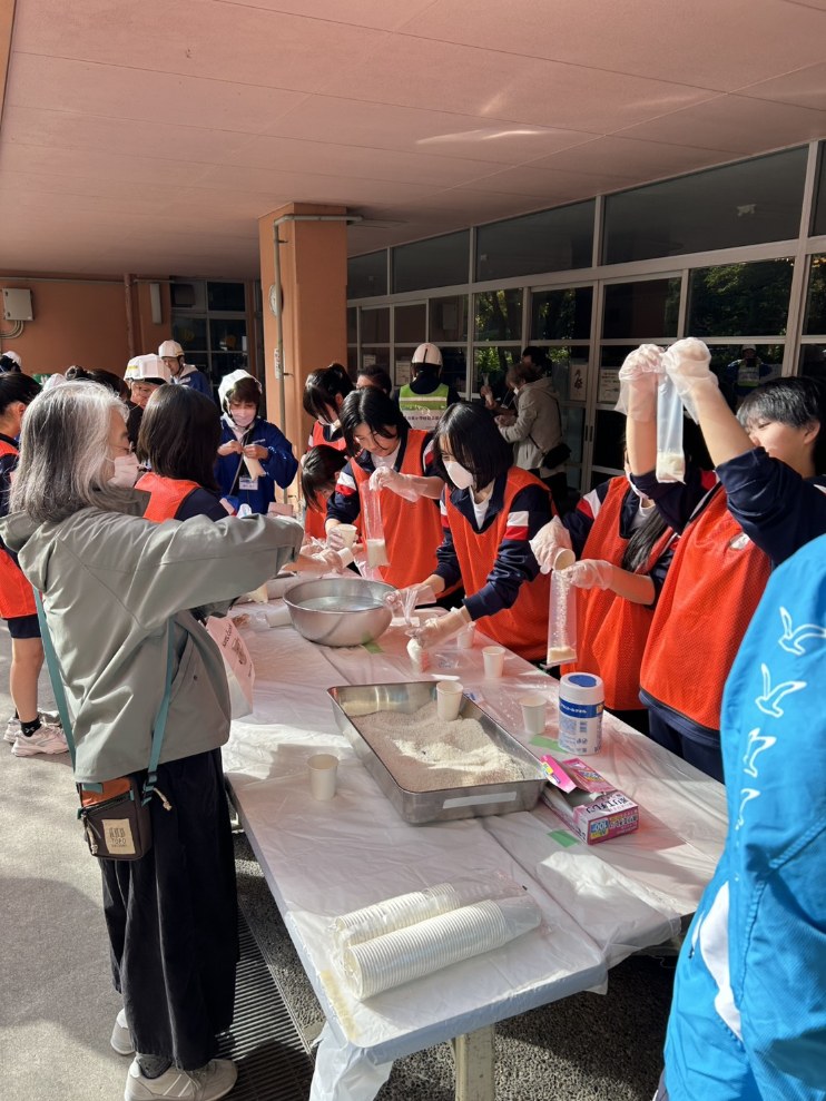 消防署のご指導のもと行ったAED講習では、命を守る技術を真剣に学びました。また、炊き出し訓練では自治会の皆さんと地元中学生が協力し、世代を超えて手際よく調理を進める姿が印象的でした。